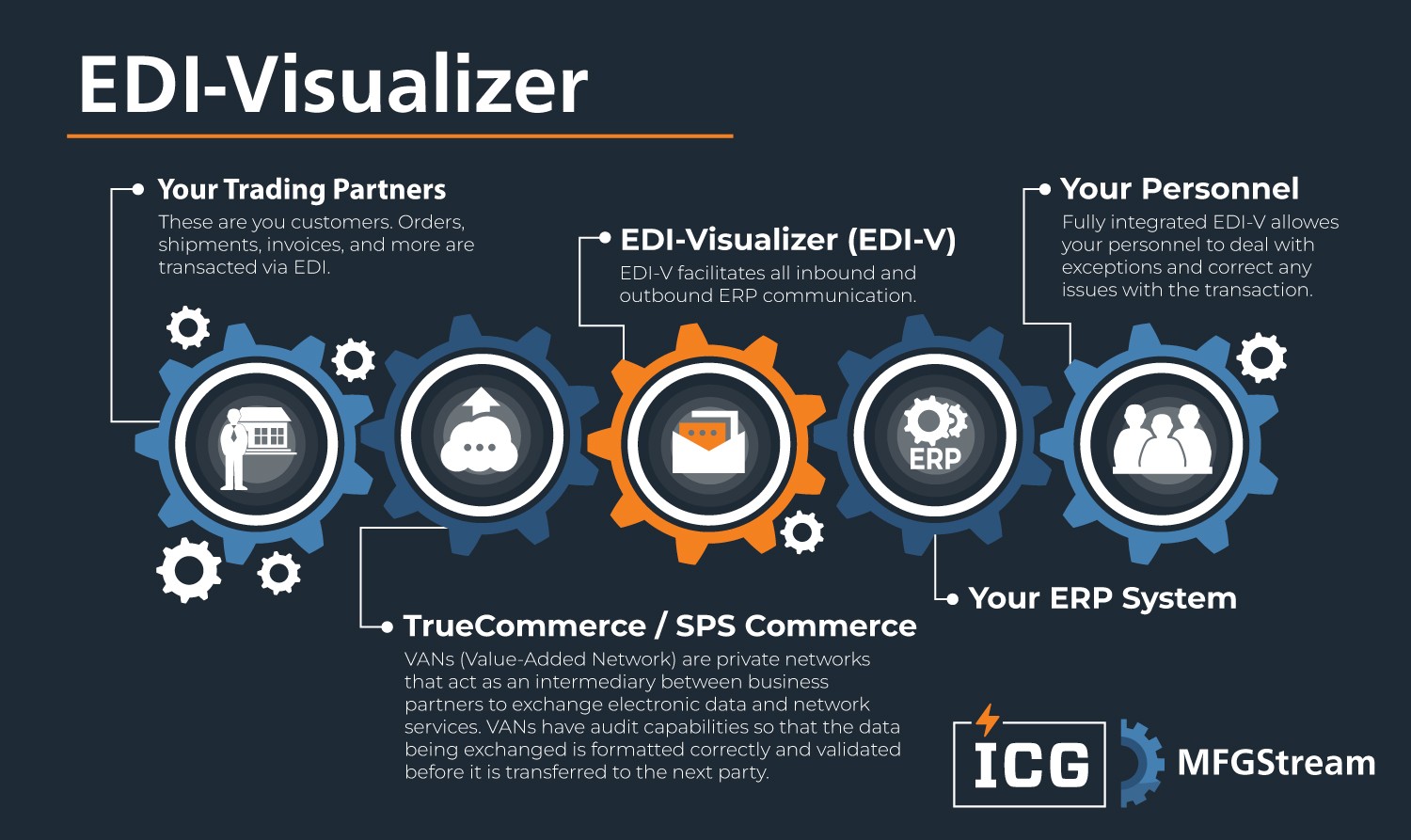 | Announcing EDI-Visualizer (EDI-V) from ICG and MFGStream for Fourth Shift ERP users to fully integrate your Value-Added Network (VAN) with your ERP. Finally, you can upgrade to a fully automated, integrated, and multi-user EDI tool... no more FS EDI module and no more waiting on FS EDI to process! EDI-V improves data accuracy, business cycle speed, and visibility of supply chains. Your organization can make more sales, reach its profit targets, and expand with increased business cycles. EDI-V’s automation eliminates manual data entry and human error. |